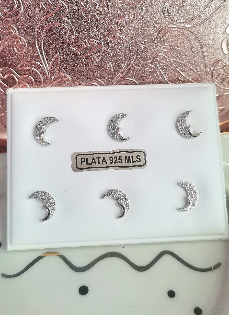 En el interior de cada luna se encuentran incrustados brillantes de circonita, que aportan un destello suave y luminoso sin resultar recargado. Estas circonitas están cuidadosamente engastadas para asegurar una pieza duradera, resistente y con un brillo constante. La combinación de la plata pulida con las circonitas crea un efecto visual muy elegante, ideal para quienes desean pendientes discretos pero con personalidad.