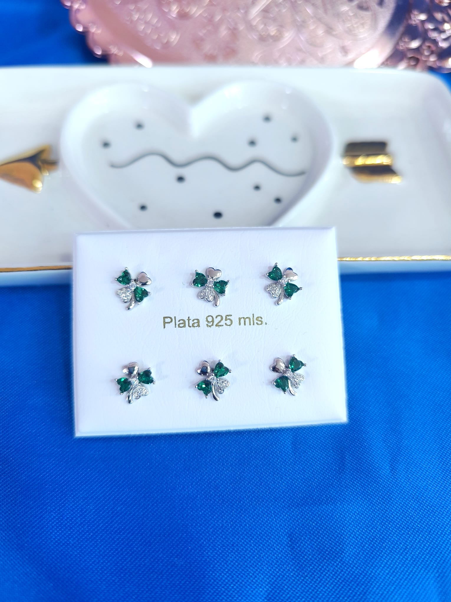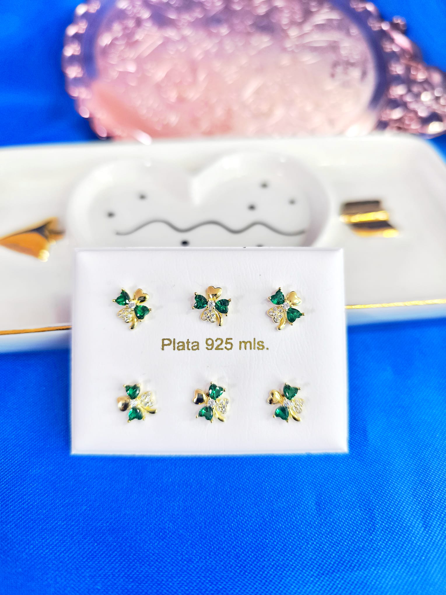 Pendientes trébol de cuatro hojas en plata o dorado, con dos hojas verde esmeralda y otras dos con acabado liso y circonitas. Elegantes, ligeros y llenos de significado.