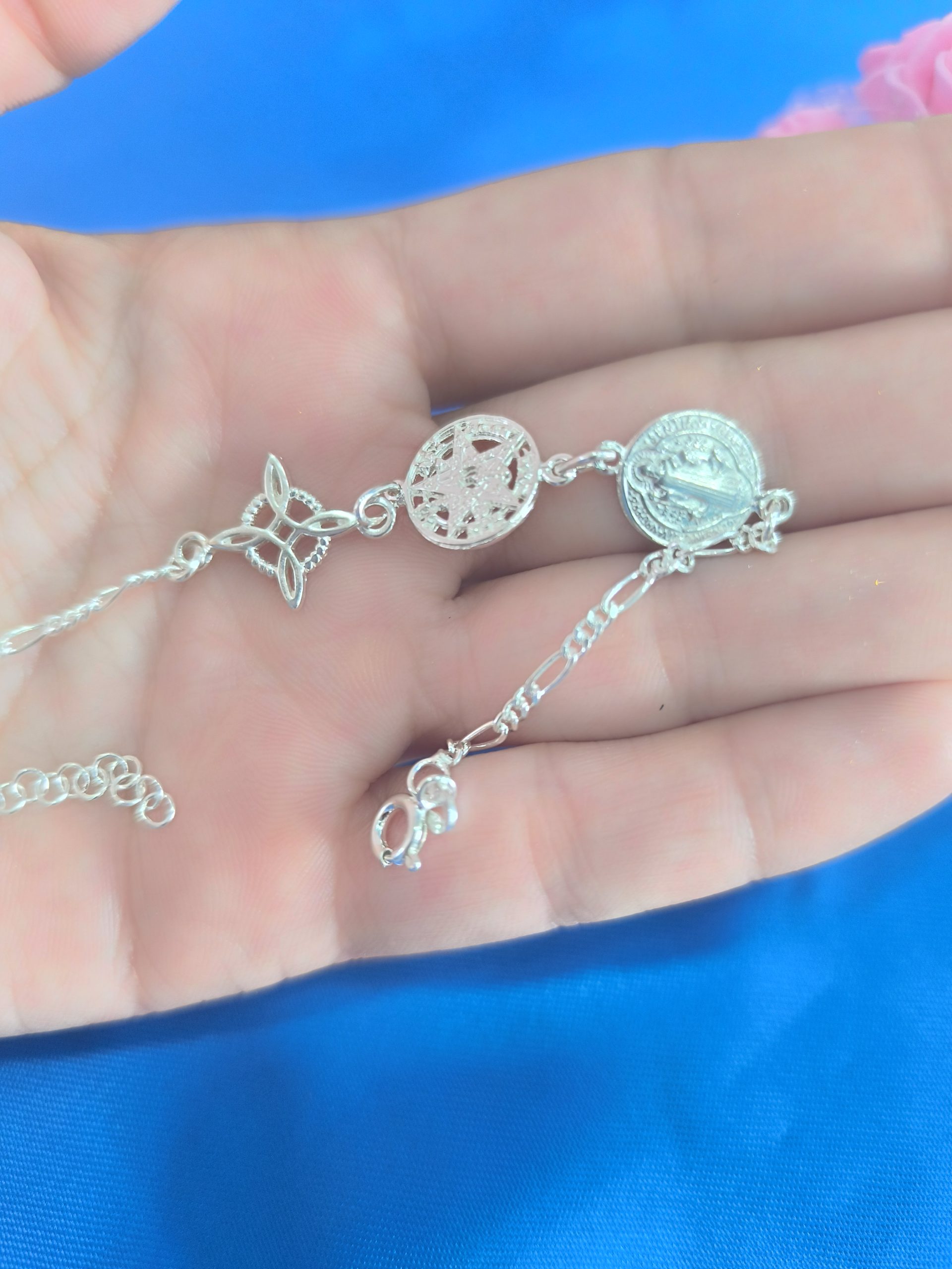 Material de Plata de Primera Ley con dijes de Nudo de Bruja, Tetragrámaton y San Benito